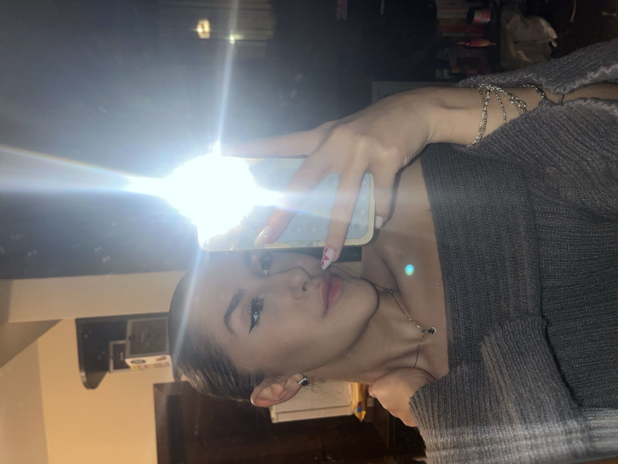 A woman is taking a selfie with the phone flash obscuring the face behind it. The woman is wearing a gray, off-the-shoulder sweater, a necklace, bracelets, and has painted nails. The background shows an interior with a beige wall, a dark doorway, and a shelf. The location is not discernible as Sofia, Bulgaria.