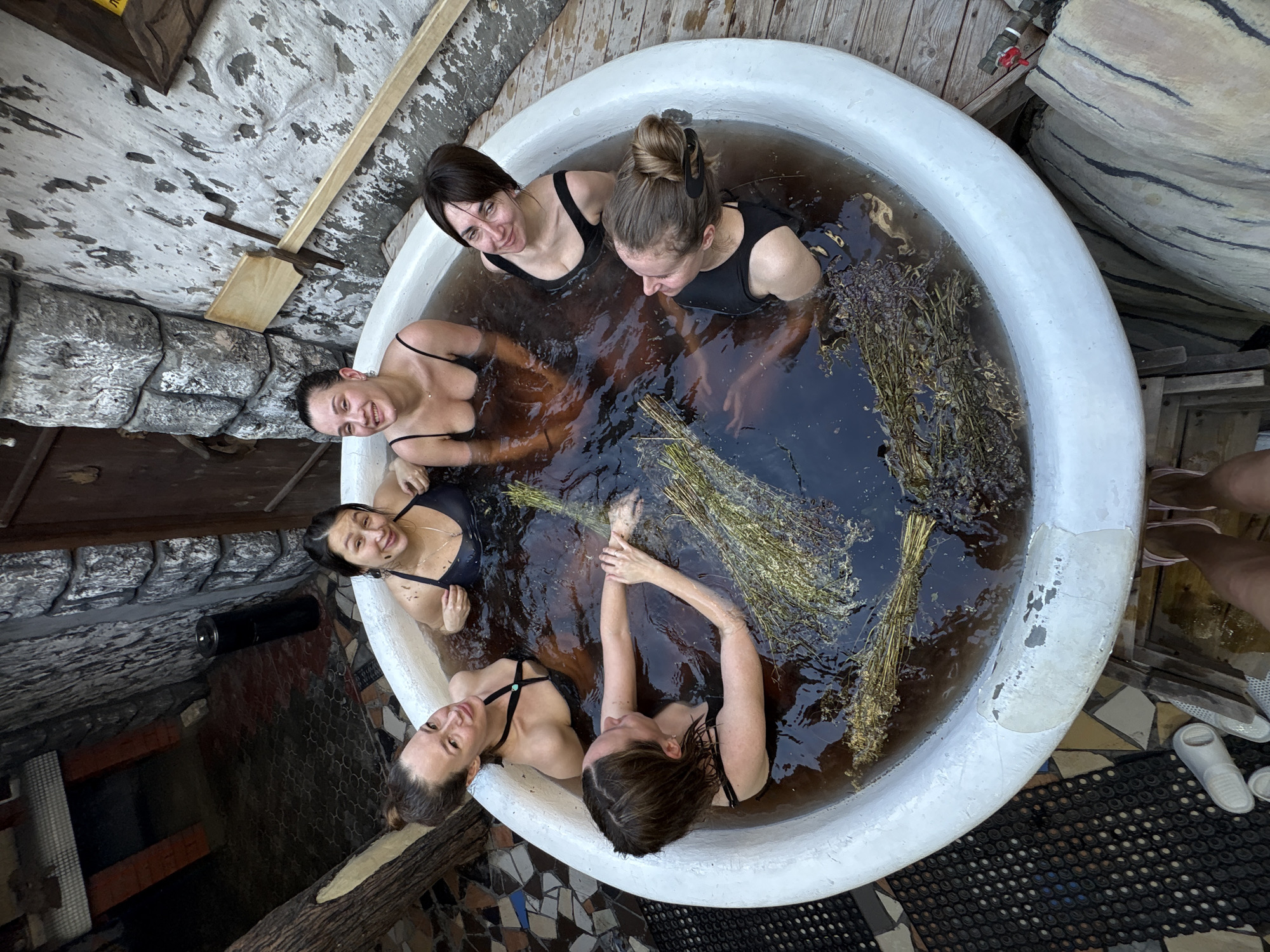 This overhead image, taken in Bely Klyuch, Russia, depicts six adult women partially submerged in a large, white, circular basin filled with dark brown water infused with dried herbs. Each woman wears a black swimsuit top and is smiling, looking generally towards the camera, suggesting a social and relaxed interaction. Bundles of dried botanical matter, including visible woody branches and leafy elements, are floating throughout the water. The basin's white rim shows areas of wear and chipping. The immediate surroundings feature a rustic aesthetic. The background consists of rough-hewn stone walls, with a dark wooden door visible in the upper left. A wooden oar or paddle is mounted horizontally on the wall to the right of the basin. The floor directly around the basin includes a mosaic-patterned tile section and a dark, textured rubber mat on the left, transitioning to wooden planks on the right. A thick, bark-covered log or structural element is visible on the far left. At the bottom center of the frame, a pair of bare feet and light pink flip-flops are visible on the wooden flooring, indicating the photographer's position. A red-handled valve and associated piping are visible on the far right edge of the frame. A black cylindrical container, possibly a waste bin, is positioned against the wall in the upper left.