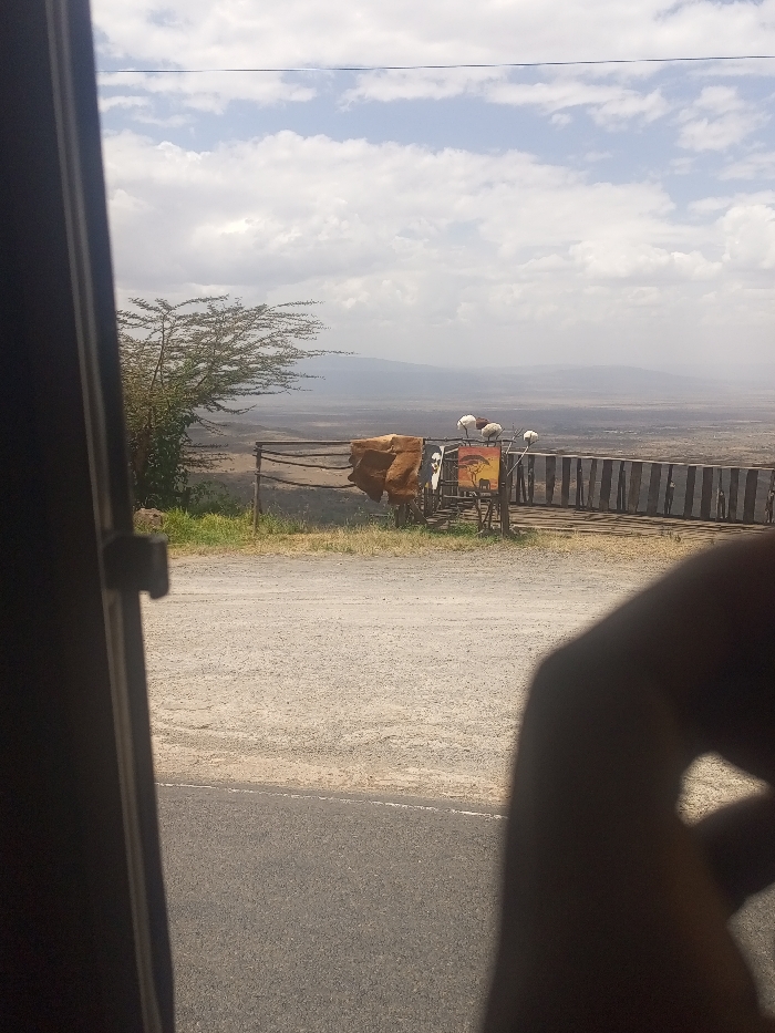 A landscape scene, partially obscured by a vehicle door frame and a hand in the foreground. Beyond, a fenced lookout point offers a view of a vast valley under a sky with scattered clouds. On the lookout fence are items including animal hides, a painted sign, and white, ball-shaped objects. The terrain appears dry with sparse vegetation, fading into a hazy horizon with distant hills. The foreground shows a paved road and a dusty surface.