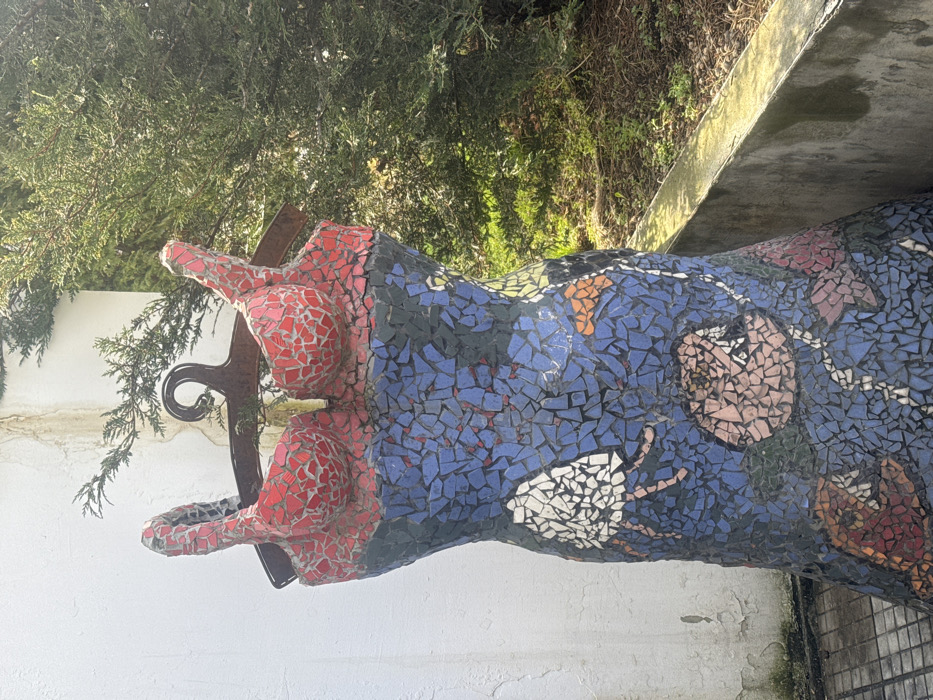 A mosaic sculpture of a stylized female torso, resembling a dress, stands outdoors in Sofia, Bulgaria