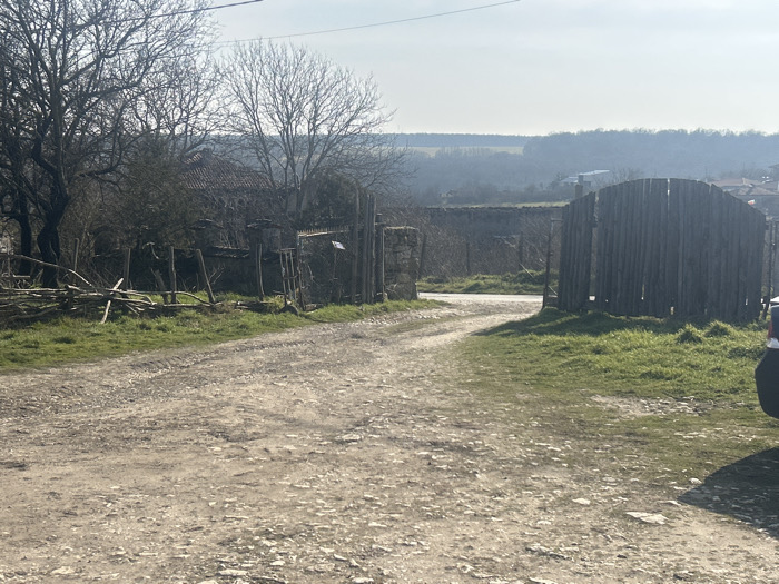 This image depicts a rural or semi-rural scene in Lyuben Karavelovo, Bulgaria, under bright daylight, likely late winter or early spring. The foreground features an unpaved, light brown dirt road with scattered small rocks and tire tracks. Patches of vibrant green grass line both sides of the road. On the far right, the rear bumper and a portion of the side of a dark-colored vehicle are partially visible. In the mid-ground, to the left, a rustic, low fence constructed from rough wooden branches and posts encloses an overgrown property. Behind this fence, numerous bare deciduous trees and dense shrubs largely obscure an old building with a reddish-brown tiled roof. A weathered stone gatepost marks an entrance to this property. To the right, a tall, dark wooden gate composed of vertical planks stands slightly ajar, opening onto a path that appears to merge with the main dirt road. Behind this gate and extending across the mid-ground is a long, light-colored stone wall. The background reveals a series of distant rolling hills, largely covered with bare trees and dormant vegetation, receding under a hazy blue sky. A few indistinct structures are faintly visible in the mid-distance valley. No individuals are present, and no discernible actions or interactions are taking place.