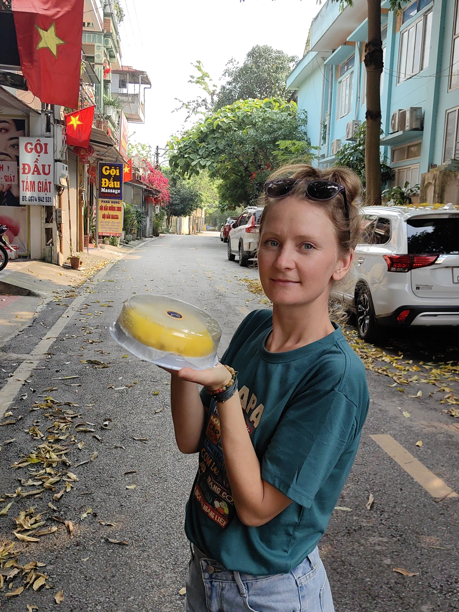Here is a forensic description of the image: **Setting:** A street in Thành phố Hà Giang, Vietnam. The street is lined with buildings, some of which have signs and Vietnamese flags. The street is paved and scattered with fallen leaves. Cars are parked along the side of the road. **Subject:** A fair-skinned woman stands in the middle of the street, holding a round, yellow cake in a clear plastic container. She is wearing a green t-shirt and jeans. Her hair is pulled back, and she has sunglasses on her head. She is looking directly at the camera and smiling slightly. **Objects:** The image contains several cars, buildings, signs with Vietnamese writing, and Vietnamese flags. Notably, there is a cake in a clear plastic container that the woman is holding. **Actions/Interactions:** The woman is posing for the camera. She is interacting with the cake in her hands. The environment suggests daily urban life in Vietnam. **Additional details:** The signs on the buildings indicate services such as hair washing (gội đầu) and massage. The fallen leaves on the street suggest a seasonal change, possibly autumn.