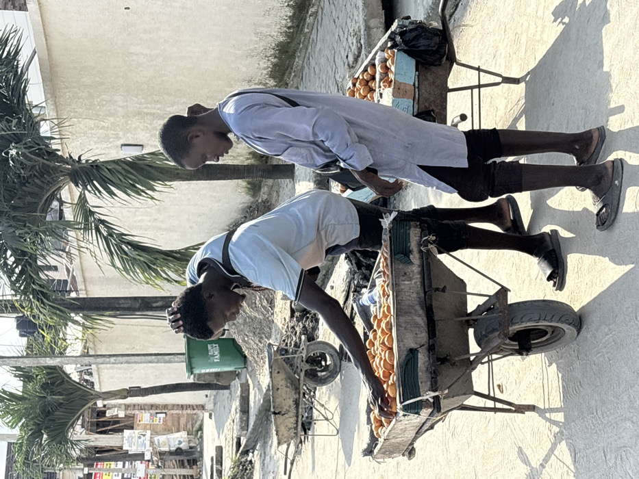 The scene depicts an outdoor urban environment in Igboefon, Nigeria, under direct sunlight. Two young adult males are positioned next to two modified wheelbarrows serving as fruit vendor carts. The ground consists of a light-colored, unpaved or minimally paved surface with scattered debris. The male on the left wears a light blue polo shirt with a dark collar, dark trousers, and dark slide sandals. He has a dark cross-body bag strap visible. He is actively leaning over the first cart, which has a wooden frame top filled with numerous spherical orange fruits, likely oranges. His left hand is reaching towards the fruits, while his right hand is placed on the back of his head. This cart features a single wheel and appears stable. The male on the right wears a light grey long-sleeved tunic (kaftan-style garment), dark trousers, and dark slide sandals. He also has a dark cross-body bag strap. He stands upright, facing slightly right, with his gaze directed downwards. He is positioned next to a second, similar wheelbarrow-cart, also filled with identical orange fruits. In the background, a light-colored concrete wall spans horizontally. Behind the wall and between the individuals, multiple green palm trees are visible. To the left, a green plastic trash bin marked "HAPPY FAMILY" stands next to a pile of light-colored sand or dirt. An empty, older wheelbarrow is also present further back on the left. Shadows are distinct and sharp, indicating a bright, clear day.