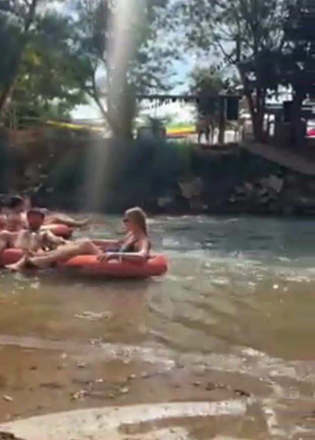 group of people tubing down a river on a sunny day. They are all floating on orange inflatable tubes. Some are sitting up while others are lying on their backs with their feet in the air. The river is surrounded by trees and a sandy beach. There is a building in the background. The sun is bright and reflects off the water.