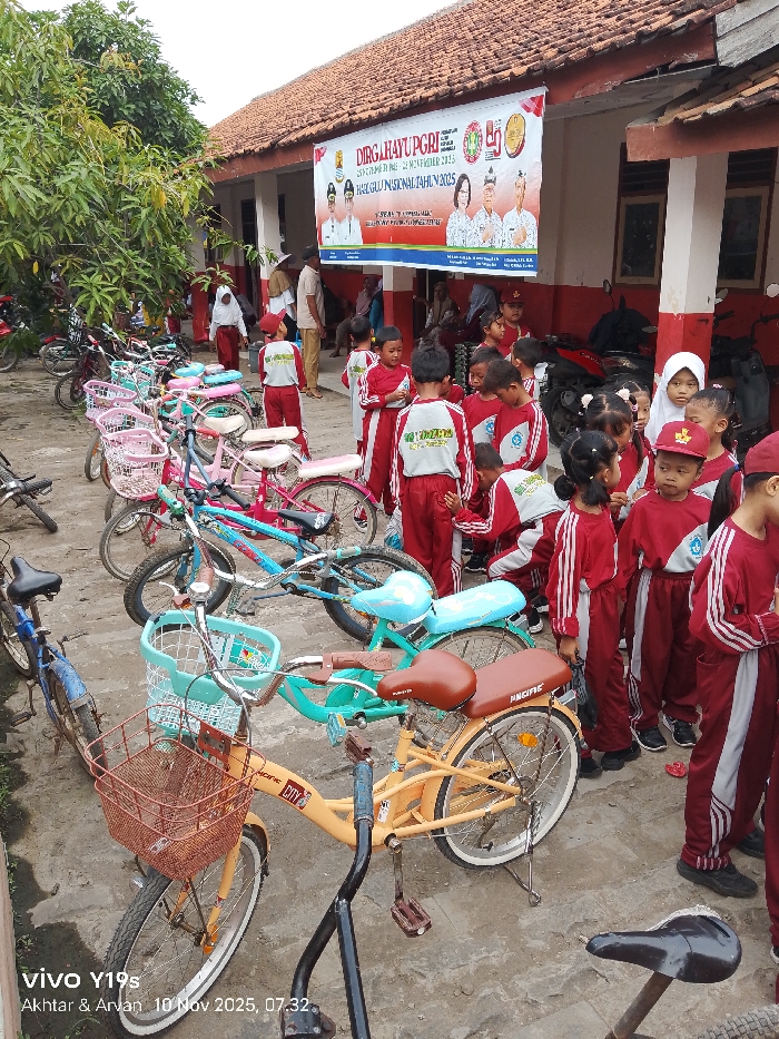 A group of children, dressed in matching red and white uniforms, stand in front of a building with a banner that reads "DIRGAHAYUPGRI" and "HARI GURU NASIONAL TAHUN 2025." Several bicycles, some with baskets, are parked nearby. The scene is captured with a smartphone camera, as indicated by the "Vivo Y19s" watermark in the corner, along with the date "10 Nov 2025, 07:32."