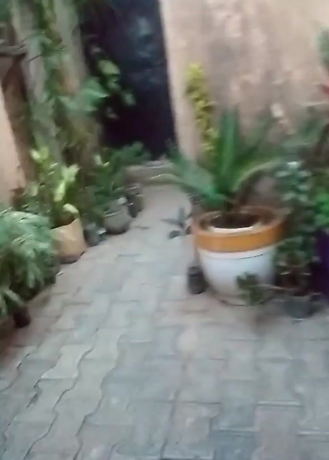 row of potted plants along a wall. The plants are of various types and sizes, with green foliage. Some of the pots are ceramic, while others are terracotta. The wall behind the plants is textured. The ground is paved with gray rectangular stones. The camera moves slowly along the row of plants.