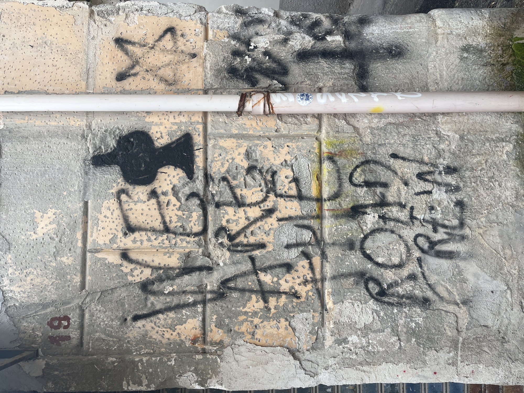 An exterior wall section of a building in Palermo, Italy, is depicted, exhibiting significant weathering and decay. The surface consists of grey concrete or stucco with large areas of peeling, faded pale yellow paint or plaster. A dark red number "19" is painted on the upper left side. Black spray-painted graffiti covers much of the central area, featuring the phrase "WE ARE ALLE ROAD CREW." Above this text, a black silhouette resembling a chess pawn is spray-painted. To the upper right, a black five-pointed star (pentagram) is visible, and on the lower right, a black inverted cross is present. A light-colored, possibly off-white, PVC drainpipe runs vertically down the right side of the wall, secured by two sections of rusty metal wire or bands. A small circular blue-and-white sticker is affixed to the lower part of the drainpipe. Faint yellow and white paint streaks are also visible on the wall and pipe. The extreme left edge of the image reveals a dark blue/grey corrugated metal rolling shutter. Patches of green moss or algae are present at the base of the wall on the lower right. No individuals or active interactions are depicted.