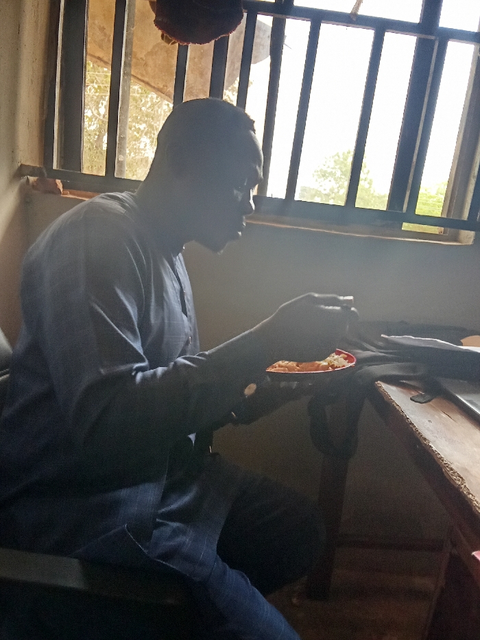 An adult male is depicted in profile, seated indoors and partially silhouetted against a brightly lit window equipped with metal security bars. He wears a dark, possibly patterned tunic or shirt and dark trousers. The man holds a small, red-rimmed white plate containing light-colored food in his left hand. His right hand holds a utensil, elevated towards his mouth, indicating he is actively eating. A wooden table with a dark surface is positioned to his immediate right. The interior features light-colored walls. Beyond the window, a bright outdoor environment with faint tree foliage is visible. A dark, possibly fabric item hangs from the upper left corner near the window. The scene is located within a building in Unknown, Unknown.