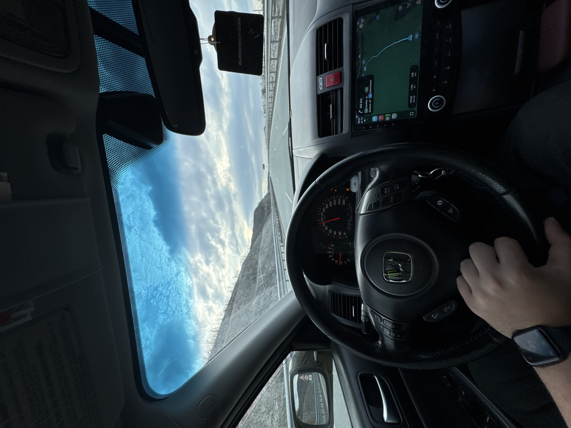 first-person perspective from inside a car. A person's hand is visible on the steering wheel, wearing a smartwatch. The dashboard displays a navigation system showing a route with "84 km" to "Montana" via "Serbia" and "Greece," with an estimated arrival time of "19:05" and "1:02." The speedometer is partially visible. An air freshener hangs from the rearview mirror. The view through the windshield shows a road and cloudy sky. The location is indicated as "Montana" via "Serbia" and "Greece," which is relevant since Yablanitsa, Bulgaria, is located on a route through Bulgaria and Serbia to Greece. The highway is possibly near Yablanitsa, Bulgaria.