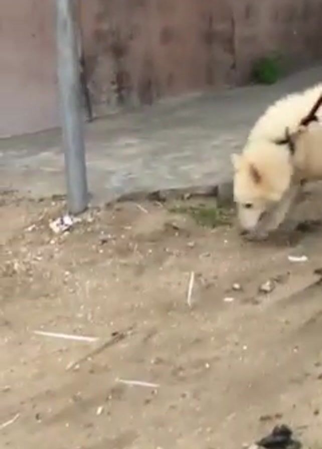 A medium shot of a light-skinned dog being walked on a leash by a dark-skinned man