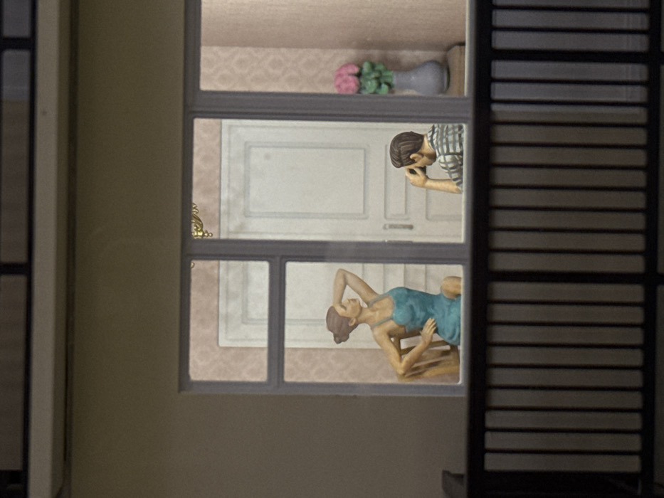 A building window reveals a scene inside. A woman in a blue dress reclines on a chair in the lower portion. Above, a man in a plaid shirt stands near a white door, appearing to take a photo with a device held to his eye. Decorative wallpaper and a vase with pink flowers are visible in the background. The window is partially obscured by another window frame with slats.