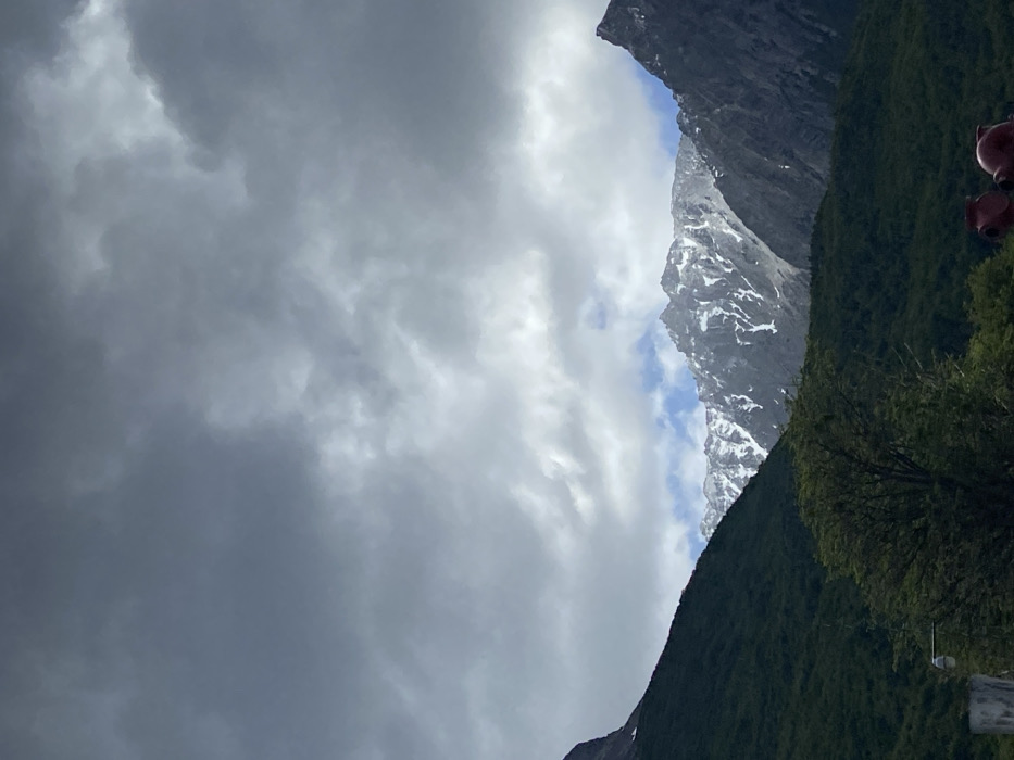 A cloudy sky dominates the view, contrasting with rugged mountains partially covered in snow. Lush green vegetation blankets the lower slopes of the mountains, creating a distinct line where the greenery meets the rocky terrain. Two red objects sit on the right edge, possibly pottery. The image is tilted sideways, adding an unusual perspective to the landscape.