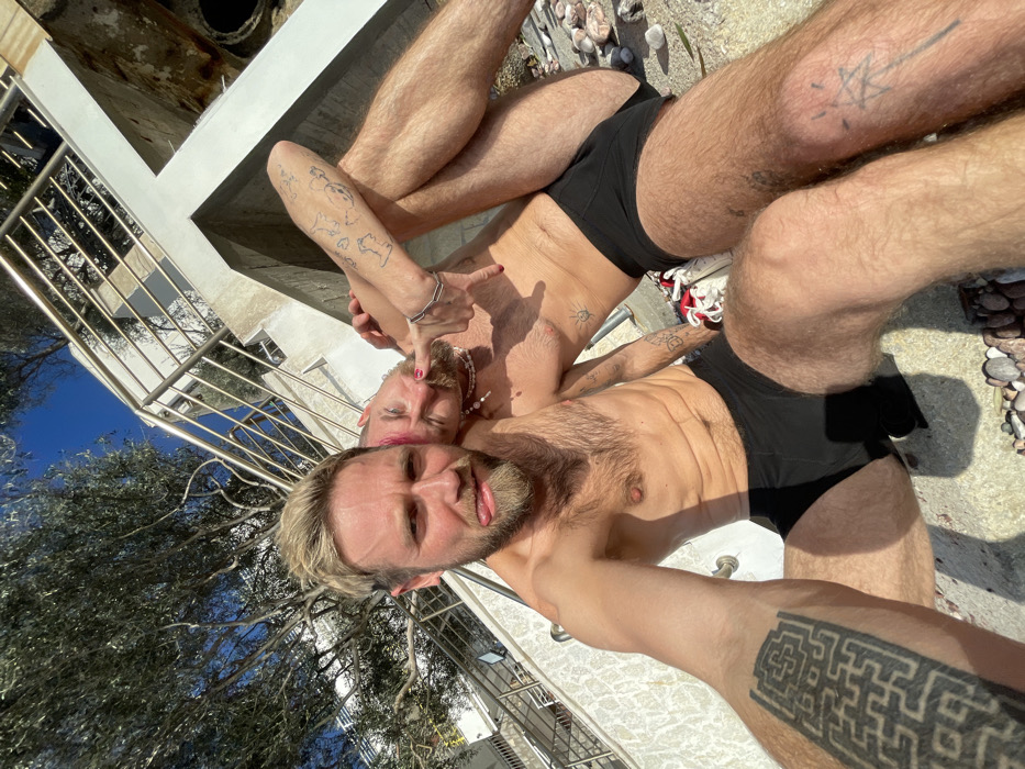 Two adult males are depicted in a selfie taken at a coastal location in Sveti Stefan, Montenegro, under bright sunlight and a clear blue sky. The individual positioned to the left, with blonde hair and a full beard, is shirtless and wears black briefs. He holds the camera, displaying a complex geometric tattoo on his inner left forearm, and has his tongue partially extended. The individual on the right, also shirtless and wearing black briefs, has facial hair and a visible pink streak in his hair above his forehead. He leans against the first man, with his right arm draped over the left man's shoulder. This individual sports various small line-art tattoos on his right arm and a star-like tattoo on his left leg, along with a white beaded necklace and a silver bracelet. His right index finger, featuring a pink painted nail, is pressed against his cheek. The immediate foreground and ground around the subjects consist of pebbles and small rocks. In the background, a concrete structure with a metal handrail ascends, with green foliage from trees visible further up against the clear sky.