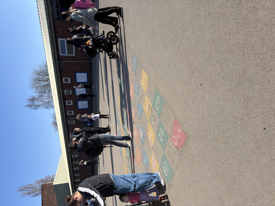 This image depicts an outdoor gathering on a paved schoolyard or similar educational facility in Rotherham, United Kingdom, under a clear blue sky. In the foreground, a multi-colored numerical grid, featuring numbers from approximately 60 to 100, is painted onto the asphalt surface. A person with long hair tied back, wearing a black and white track jacket, blue jeans, and white Adidas sneakers, stands on the far left, leaning slightly towards a small child in a pink striped shirt and purple pants who is positioned next to a black and red wheeled device, possibly a stroller or walker. In the mid-ground, an individual wearing a black jacket, blue jeans, and a black backpack stands facing away, appearing to look upwards or to the right through a handheld device. To their right, a small child in a white t-shirt and dark trousers stands alone, looking left. Further to the right, another person in a plaid shirt and dark trousers walks to the right, pushing a black stroller, with a pink backpack visible on their back. The background features a long, single-story brick building with multiple small, square windows and a light-colored, possibly corrugated metal, roof. Several adults and some children are gathered along the building's length, generally oriented towards the right side of the frame, with two light blue notice boards visible on the brick wall. Bare trees are visible above the building and against the horizon. Long shadows are cast across the paved ground, indicating bright sunlight from the left.