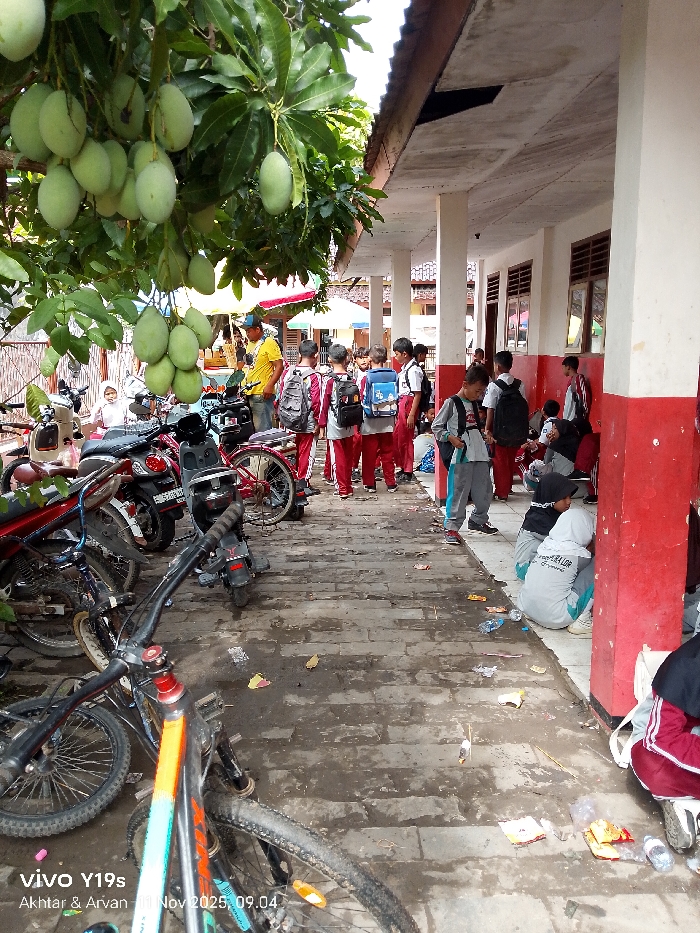 A bustling school scene shows students in red and gray uniforms gathered outside a building with red and white pillars. Bicycles and motorbikes are parked nearby under a tree laden with green mangoes. A vendor in a yellow shirt stands amongst the students. Litter and debris scatter the brick-paved ground, adding to the lively atmosphere. The image captures a typical school day in what appears to be a tropical climate.