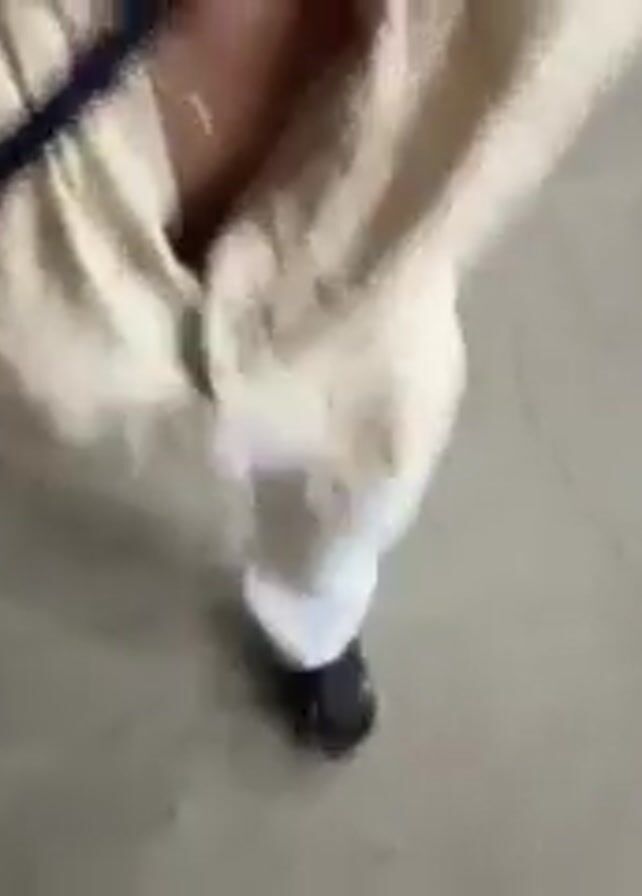 A person walks towards the camera, viewed from a high, canted angle. The person is wearing a light beige, partially unbuttoned shirt or jacket, white pants, and black shoes with white accents. A dark-colored strap, likely from a bag, is visible across their chest. The person walks on a gray concrete surface.