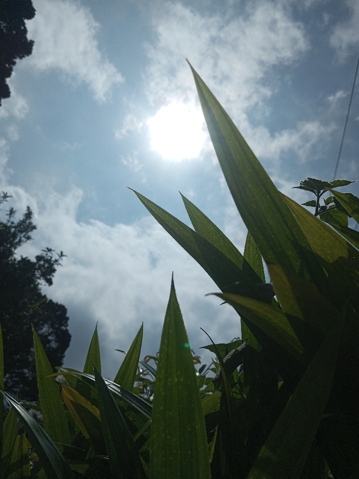 The image displays an outdoor, low-angle perspective, looking upwards towards the sky in Neerveli, Sri Lanka. The foreground is dominated by multiple long, pointed, green leaves, consistent with plant foliage such as pandan, partially silhouetted and backlit by direct sunlight. These leaves show varying degrees of sharpness and translucency, with some venation visible. The upper portion of the frame features a light blue sky with scattered white cumulus clouds. A bright, overexposed disk, representing the sun, is centrally positioned in the upper half of the image, acting as a strong light source. Dark, silhouetted tree foliage is visible against the sky on the left side. A faint, thin, dark line, possibly a utility wire, traverses the upper right quadrant of the image. No individuals, animals, or overt human activity are depicted.