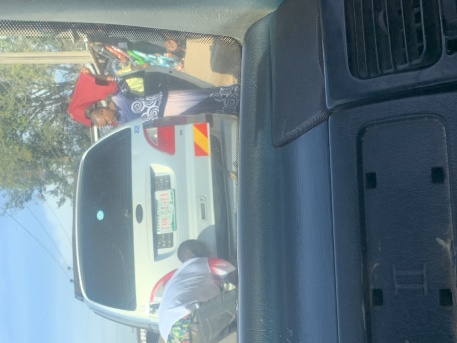 A silver minivan is captured from inside a vehicle, likely through the windshield. The minivan's license plate reads "TNK 649XA." A woman wearing a blue and white patterned top and a red head covering stands by the open back. Behind her, various items are stacked inside the minivan. A person in a white shirt and patterned shorts is near the back of the minivan. Parts of the vehicle's interior like a dashboard and air vents are also visible.
