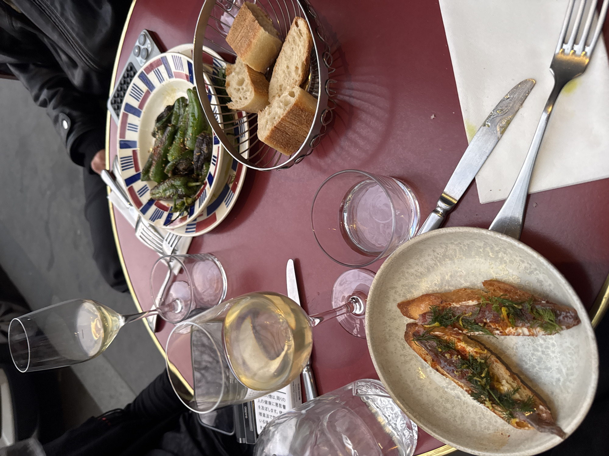 This is a photograph of a table in a restaurant setting, potentially located in Paris, France, given the style of food and overall ambiance