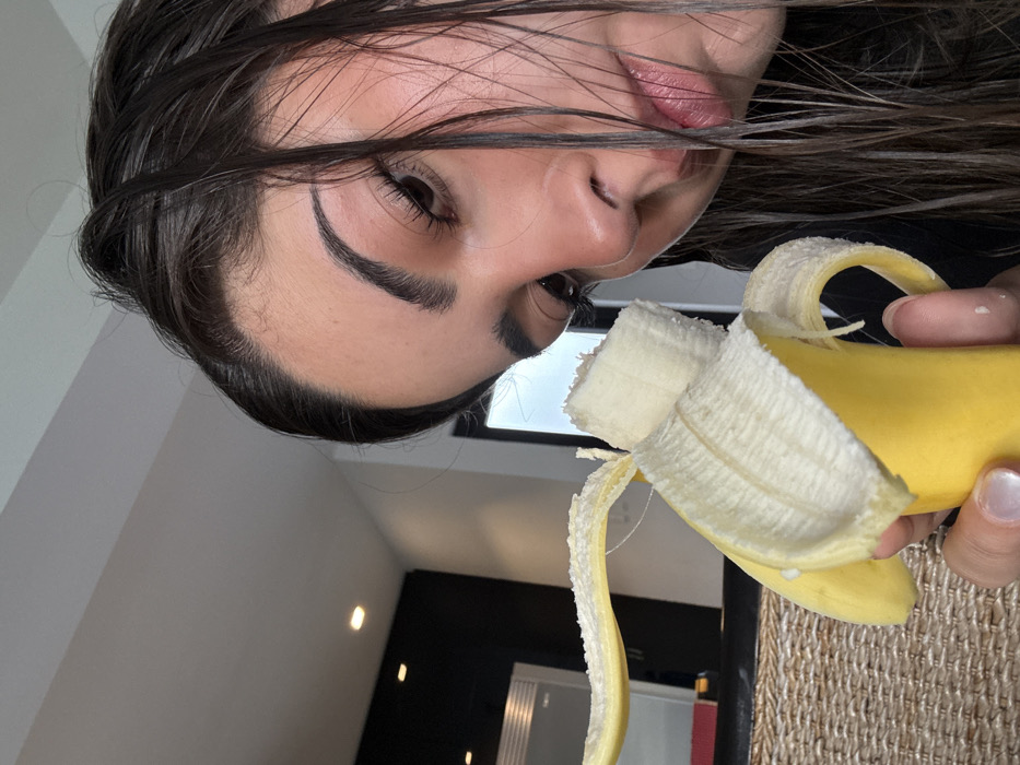 An eye-level, upside-down shot features a woman with dark hair holding a peeled banana close to her face