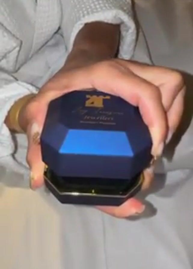 A person wearing a white robe opens a small, blue Joy Treasurers Jewellers jewelry box to reveal a pair of square earrings with dark blue gems and white settings. The person is holding the box while sitting on a white bed.