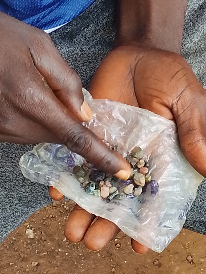 At Oduma Hill, Nigeria, a close-up, overhead image captures two hands with dark skin tones examining a collection of small mineral fragments. The right hand, cupped, holds a translucent plastic bag containing approximately two dozen irregular-shaped stones. These stones exhibit various colors, including shades of green, purple, pinkish-brown, and grey, with individual pieces generally under one centimeter in maximum dimension. The index finger of the left hand is positioned within the bag, resting among the fragments, suggesting an action of sorting or detailed inspection. The immediate background shows sections of blue and grey fabric, while the foreground reveals brown, gravelly soil containing small pebbles.