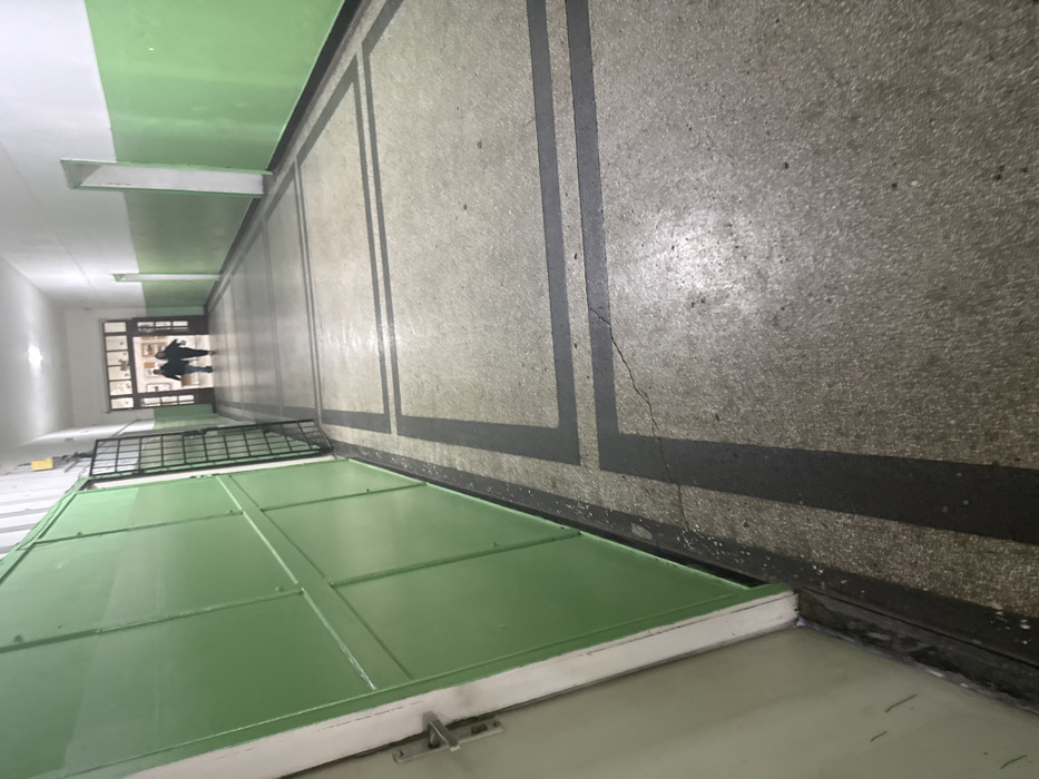 An indoor hallway in Cherven Bryag, Bulgaria, is depicted from a low-angle perspective, looking down its length towards an illuminated entrance/exit. The hallway features walls with a bright green lower section and a white upper section. On the immediate left, a light-colored door with a silver handle is partially visible, adjacent to a series of connected green panels or doors that extend down the wall. A dark metal gate is partially ajar along the left wall, positioned further down the hallway from the foreground door. The right wall presents multiple recessed doorways with white trim. The floor consists of gray terrazzo or concrete, marked with distinct dark gray or black rectangular border patterns. Visible cracks are present in the flooring. Two indistinct human figures, appearing as dark silhouettes, are walking away from the viewer towards a glass-paned door structure at the far end of the hallway. Overhead lighting fixtures are present along the white ceiling.