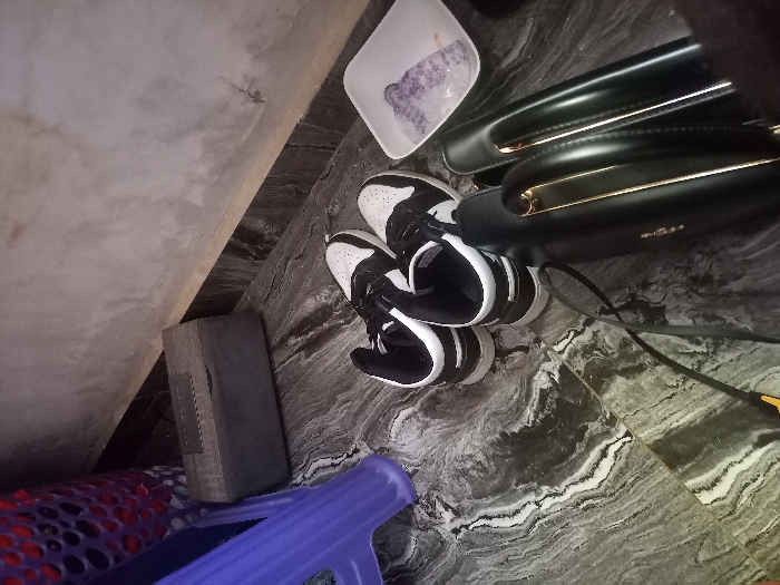 The image displays an indoor scene in Karmajiji, Nigeria, specifically focusing on a section of a floor and an adjacent wall. The floor is covered with grey and white marble-patterned tiles, while the wall is a light, possibly off-white, color with a dark skirting board at its base. Objects present include: 1. A pair of black and white sneakers, likely athletic shoes, positioned centrally on the tiled floor. 2. To the right of the sneakers, a black handbag with gold-colored metallic accents and a black strap is partially visible. 3. Further to the right, a small white rectangular plastic bowl contains a crumpled light-colored, possibly purple or white, fabric item or plastic bag. 4. On the left side of the frame, a segment of a purple plastic object, consistent with a chair leg or stool base, is present. 5. Adjacent to the purple object and against the wall, a grey rectangular object, resembling a portable speaker or a small storage box, rests on the floor. 6. A portion of a perforated purple plastic container or basket is also visible on the far left, partially obscured by the frame. No individuals are depicted, and no explicit actions or interactions are occurring. The items appear to be stationary on the floor.