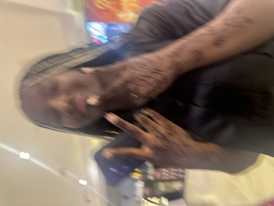 A blurry, medium-shot photograph captures a young female subject indoors in Itirin, Nigeria. The individual exhibits dark skin and long dark hair with lighter-colored strands. She is dressed in a dark, collared garment. Both hands are raised; the left hand (viewer's right) holds a dark-colored smartphone horizontally while extending the index and middle fingers in a "V" gesture. The right hand (viewer's left) also displays a "V" gesture with its index and middle fingers. Both hands and forearms are adorned with intricate dark patterns, consistent with henna or temporary tattoos. Fingernails have light-colored polish. The subject's face is out of focus, with lips slightly pursed. The background, also out of focus, shows overhead artificial lighting, indistinct retail shelving or display units on the left, and a blurred, brightly lit, reddish-orange structure or sign on the right, indicating a commercial indoor environment such as a shopping mall or large store.