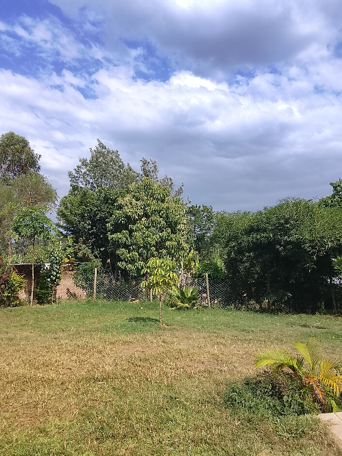 The image depicts an outdoor daytime scene within Mahiakalo ward, Kenya. The foreground and midground consist of a grassy area, presenting a mosaic of green and drier, light brown patches. A small, light green sapling stands centrally in the midground. A chain-link fence, supported by several wooden posts, traverses horizontally across the midground, separating the grassy expanse from a dense array of trees and bushes in the background. The vegetation behind the fence is characterized by various species exhibiting shades of green foliage. To the left, a section of a light brown wall structure is partially visible behind the fence and amidst the plants. In the lower right corner, a small bushy plant with yellowish-green fronds is partially obscured. The sky, occupying the upper portion of the frame, displays a mix of white cumulus clouds and darker grey stratocumulus clouds against a partially visible blue sky. No individuals, animals, or active subjects are present.