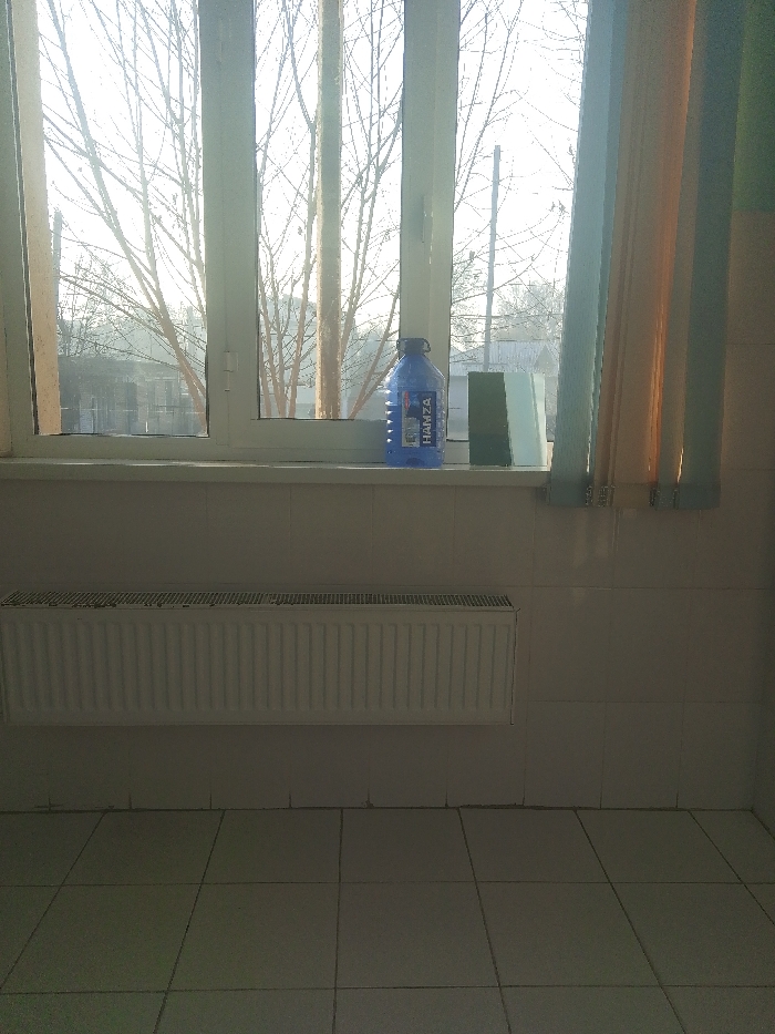 A brightly lit room features a white-framed window showing bare trees. On the window sill sits a blue plastic bottle labeled "HAMZA" next to two objects, one dark green and the other light blue. A white radiator hangs below the window. The wall and floor are tiled in white. The right side of the window is covered by partially drawn curtains with vertical stripes of orange, blue, and green.