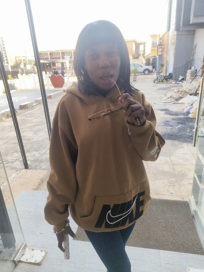 The scene depicts a female individual standing in a doorway in Gura Top, Nigeria. She is positioned facing the camera, wearing a light brown (tan) hooded sweatshirt featuring a prominent black "NIKE" logo and white swoosh on its front pouch pocket, and dark blue jeans. Her dark, shoulder-length hair frames her face. She holds a pair of thin-framed glasses with brown lenses in her right hand, with one arm of the glasses touching her mouth as her tongue slightly protrudes. Her left wrist displays a multi-colored beaded bracelet, and her left hand holds a small, light-colored rectangular object. The background reveals an urban environment under clear daytime skies. To the left of the subject, a large, red heart-shaped sculpture stands on a paved area, with a multi-story building featuring reddish-brown and lighter sections visible beyond it. Scattered concrete blocks are on the ground. To the right, another multi-story building appears to be under construction or renovation, characterized by grey walls and visible construction debris, including piles of rubble and white sacks. A ladder leans against this building, and a light-colored sedan is parked further back. The immediate ground near the subject includes a grey floor mat and light-colored paving.