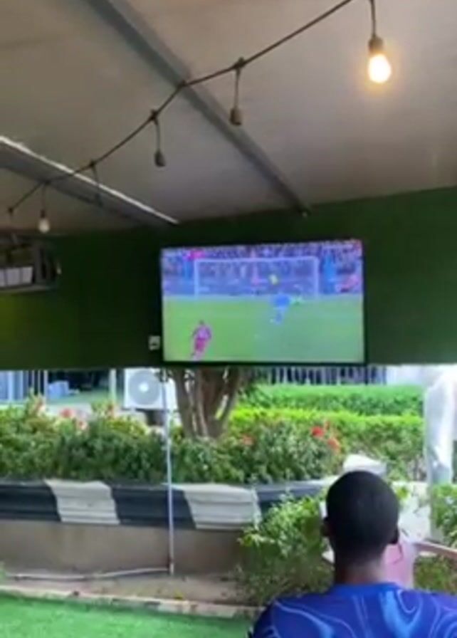 A person is watching soccer on a TV while sitting in a chair on a patio, which is decorated with artificial grass and string lights. Other people are sitting at a table nearby. The person watching the TV reacts to something that happens in the game. The other people are laughing and seem excited.