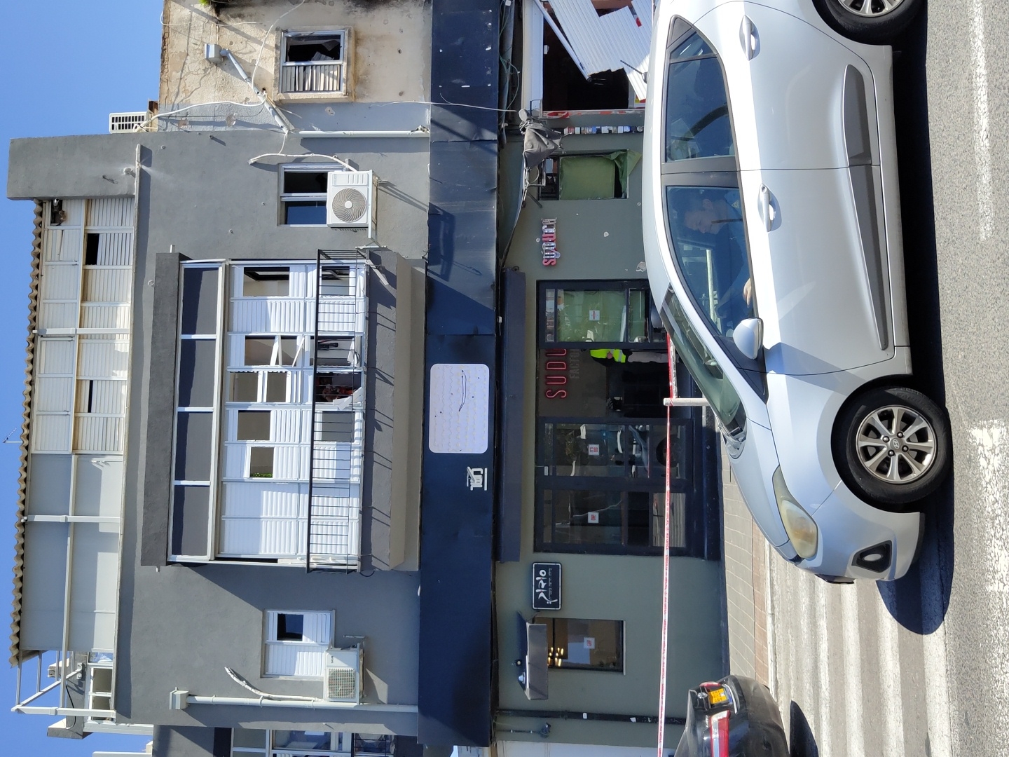The image displays a street-level view of an urban area in Givatayim, Israel, under a clear blue sky. The central structure is a multi-story building with a dark grey facade, featuring a commercial establishment on the ground floor. The ground-floor storefront is identified by signage, including "SUDU FACTORY" and "SUBITCH" in red lettering, and a Hebrew sign reading "מקום" (Makom). Double glass doors serve as the entrance, and a person wearing a yellow-green reflective vest is visible inside, near the doors. A horizontal red and white caution tape is stretched across the front of the storefront at knee height. Above, the first floor of the grey building features a balcony with a black metal railing. Behind the railing, a large bay window structure contains multiple white louvered shutters, some partially open. A red and white object is draped over the balcony railing. The uppermost visible section of the grey building has additional white louvered structures, possibly an enclosed rooftop area. Two exterior air conditioning units are mounted on the grey facade. To the immediate right of the grey building stands an older, light-colored building exhibiting visible surface damage and exposed plaster. One window on this adjacent building has broken panes behind a metal security grate. In the foreground, a silver hatchback vehicle is positioned on a white-striped zebra crossing on an asphalt road. A male driver is visible within the silver vehicle. The rear section of a black sedan is partially visible to the left of the silver car.