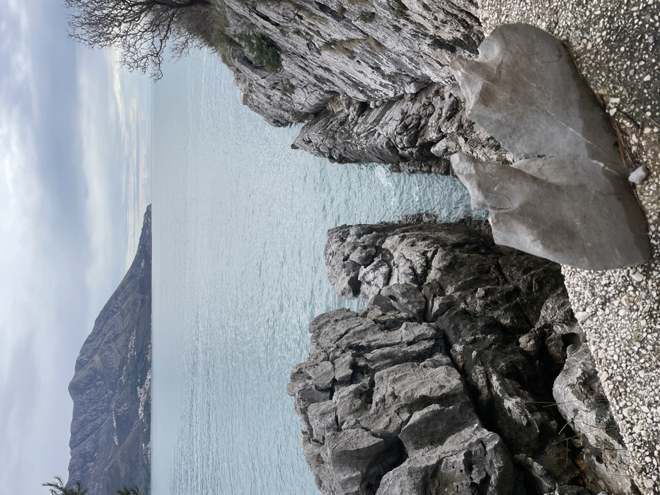 The image depicts a coastal landscape in Budva, Montenegro, under an overcast sky. The foreground features a light grey gravel path or ground surface, with a prominent, irregularly shaped, grey rock lying horizontally on the right side. Ahead, the terrain transitions into rugged, grey rock formations and cliffs dropping steeply into the sea. A narrow, dark crevice or channel separates two large rock masses, through which turquoise-blue seawater is visible, exhibiting minor surface ripples. To the right, the cliff face is steep, with sparse green shrubbery and a leafless, gnarled tree clinging to the upper edge. The midground is dominated by the calm, turquoise-blue Adriatic Sea, stretching towards the horizon. In the distant background, a prominent dark grey mountain range extends horizontally, with numerous small white buildings visible along its base near the coastline. The sky above is entirely covered by a uniform layer of grey clouds. No individuals, explicit actions, or direct interactions are visible within the scene.