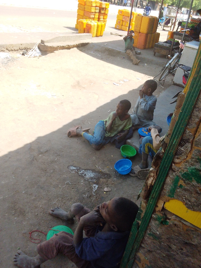The image depicts an outdoor scene in the city of Zango, Nigeria, under bright daylight with strong shadows. Five individuals, appearing to be children, are present. In the immediate foreground, a child lies on their right side on a dirt ground, wearing a dark blue shirt and brown pants, looking upwards. A green plastic bowl and a red string are near their legs. To the right of this child, a weathered structure with corrugated green and yellow material is visible. Further back, three children are seated on the dirt ground, partially in the shadow of the structure on the right. One child on the left wears a light green shirt and blue pants, with light brown sandals beside them, looking towards the right. Next to them, a child in a light grey tunic appears to be holding something to their mouth, with a blue plastic bowl nearby. Partially obscured by the child in the grey tunic, a third child is visible with blue and yellow patterned clothing and a blue plastic bowl. In the mid-ground, a young person in a green shirt and tan pants is seated on the ground near stacks of yellow jerrycans, appearing to drink from a small cup. The background features a paved road with more stacks of yellow plastic jerrycans, a bicycle parked next to a white cooler-like object, and a market stall displaying items. A raised concrete curb separates the dirt ground from the paved road. The ground in the foreground shows patches of white residue and small debris.
