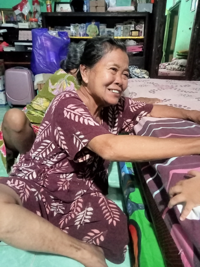 A smiling woman with short, dark hair is seated on the floor, wearing a maroon short-sleeved shirt and pants with a white leaf pattern. She leans forward, her arms extended towards a bed with maroon and white striped bedding and a colorful mattress protector. An unseen person's hand touches the bed. Another woman sits behind her, partially obscured. The background includes a shelf stocked with items, a purple bag, and a light pink suitcase. The floor is a pale green.