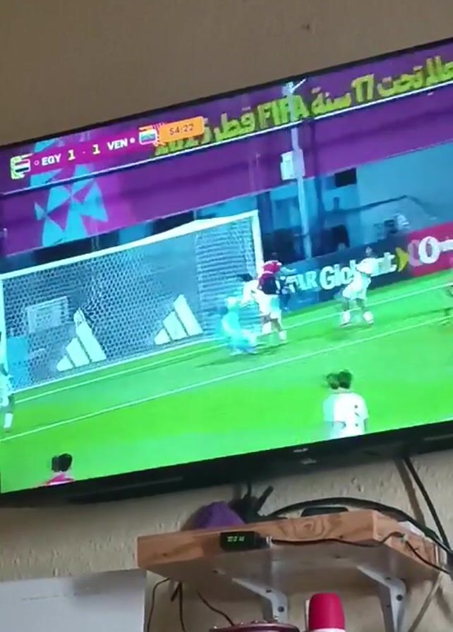 TV screen displaying a soccer game between Egypt and Venezuela, with the score tied at 1-1