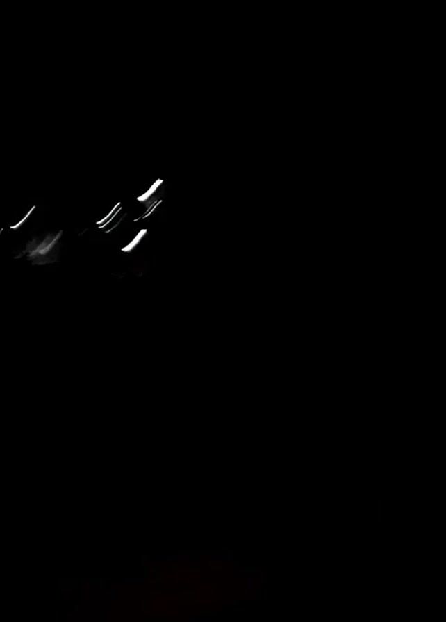 dark scene with light sources. Initially, a bright light from a vehicle's headlight illuminates a road surface. Then the view shifts, and the scene becomes darker, showing a series of curved light trails that suggest the movement of lights in the darkness. The environment appears to be outdoors at night.