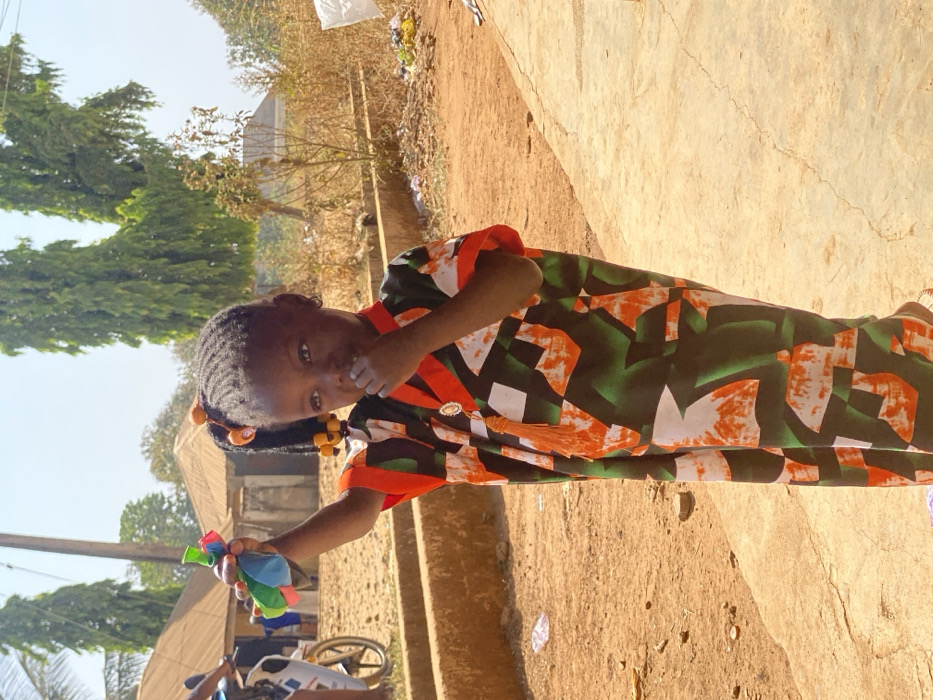 A young child stands in the foreground on a reddish-brown dirt path in the city of Maigizo, Nigeria. The child, with dark skin and braided hair styled into two pigtails with orange beads, wears a loose-fitting tunic featuring an abstract pattern of orange, green, black, and white geometric shapes. A decorative brooch with an orange tassel is pinned to the chest area of the garment. The child's right arm is raised, holding a small, multi-colored object (blue, green, pink elements) above their head. The left hand is positioned near the child's mouth. The child's gaze is directed slightly to the viewer's left. In the mid-ground to the left, a white and grey motorcycle is partially visible behind the child. Behind the motorcycle and further into the background, several single-story structures with corrugated metal roofs are present. The ground features uneven terrain with patches of dirt and concrete, and scattered debris including plastic and paper. Tall, green trees are visible in the background against a clear, bright sky.