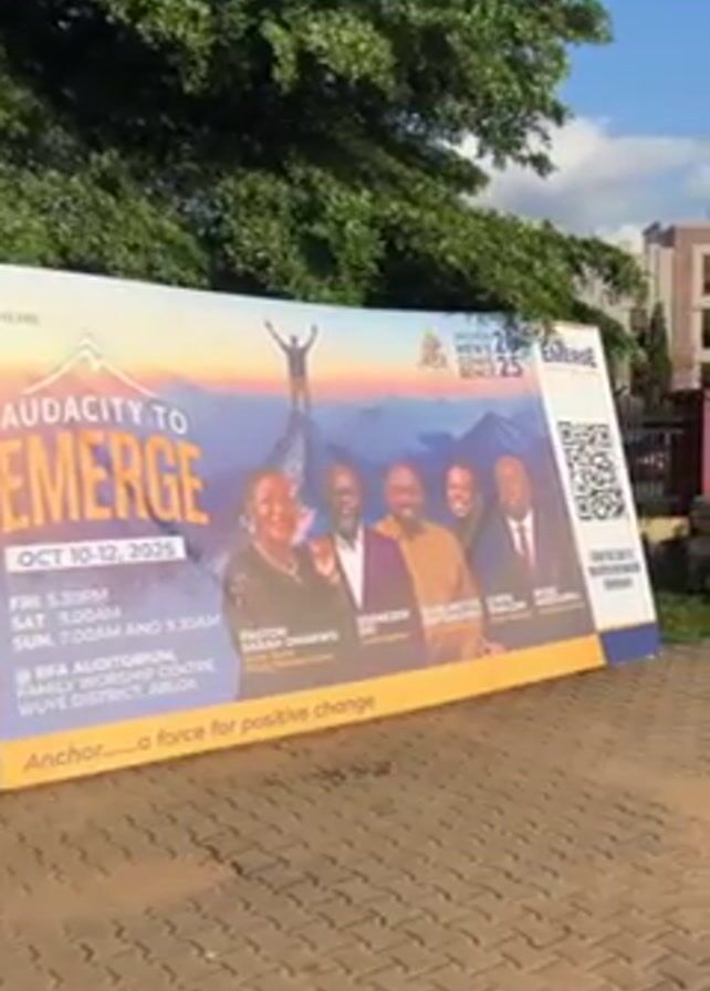 poster advertising an event titled "Audacity to Emerge" taking place October 10-12, 2025. The poster features images of several individuals, including Pastor Sarah Omakwu, Ebenezer Dei, Darlington Onuoha, Chris Shalom, and Bose Madupin. The event will be held at the RFA Auditorium, Family Worship Centre, Wuye District, Abuja. The poster also mentions "Anchor...a force for positive change." The video is taken outside, with a tree visible in the background and a brick sidewalk in the foreground. There's traffic noise audible in the background.