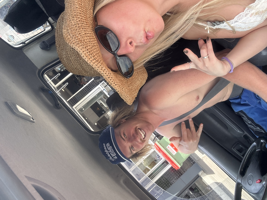 An upside-down selfie taken inside a car. A woman wears a straw hat and sunglasses, pouting at the camera. A topless person in a blue hat smiles, gesturing with their hand. A glimpse of a building is seen through the sunroof and side window. One person wears a white lace top, and a safety belt cuts across the chest of the other. Blue shorts and a steering wheel are also visible.