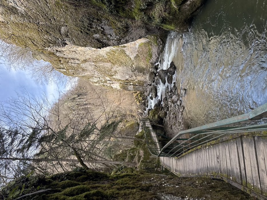 The image depicts a natural river gorge. The specific city and location are unknown; however, the scene is an outdoor, rugged natural environment. A river, characterized by flowing water and scattered boulders, occupies the center and right mid-ground, extending into the background where rapids are visible. A wooden boardwalk, approximately 1.5 meters wide with a dark green metal railing on its right side, traverses the left bank of the river, curving gently away from the viewer. The left wall of the gorge is a steep, rock face densely covered in green moss. The right wall consists of exposed rock formations with patches of lighter green and yellow moss. Deciduous trees with bare branches and some evergreen trees are visible on the upper slopes and rim of the gorge. The sky above is partially blue with minimal cloud cover. No individuals or animals are present. The scene is illuminated by natural daylight.