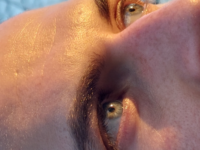 A tightly cropped, high-angle close-up portrait shot captures the upper face of an individual