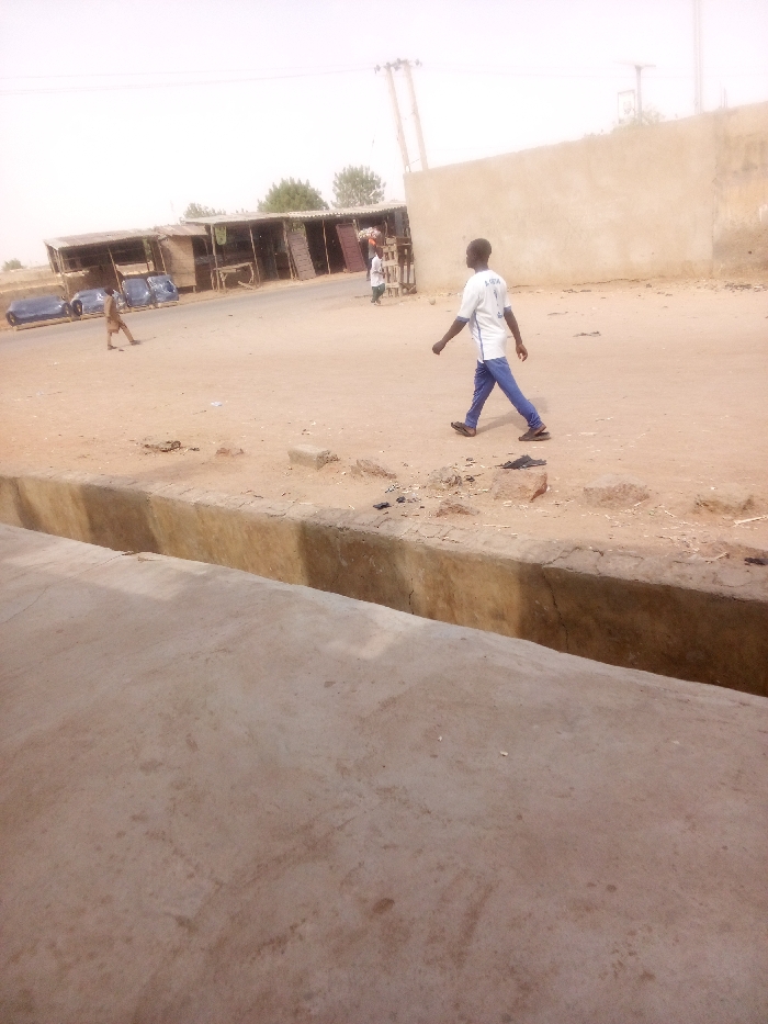The image depicts an outdoor street scene in Tudun Murtala, Nigeria, under hazy daylight conditions