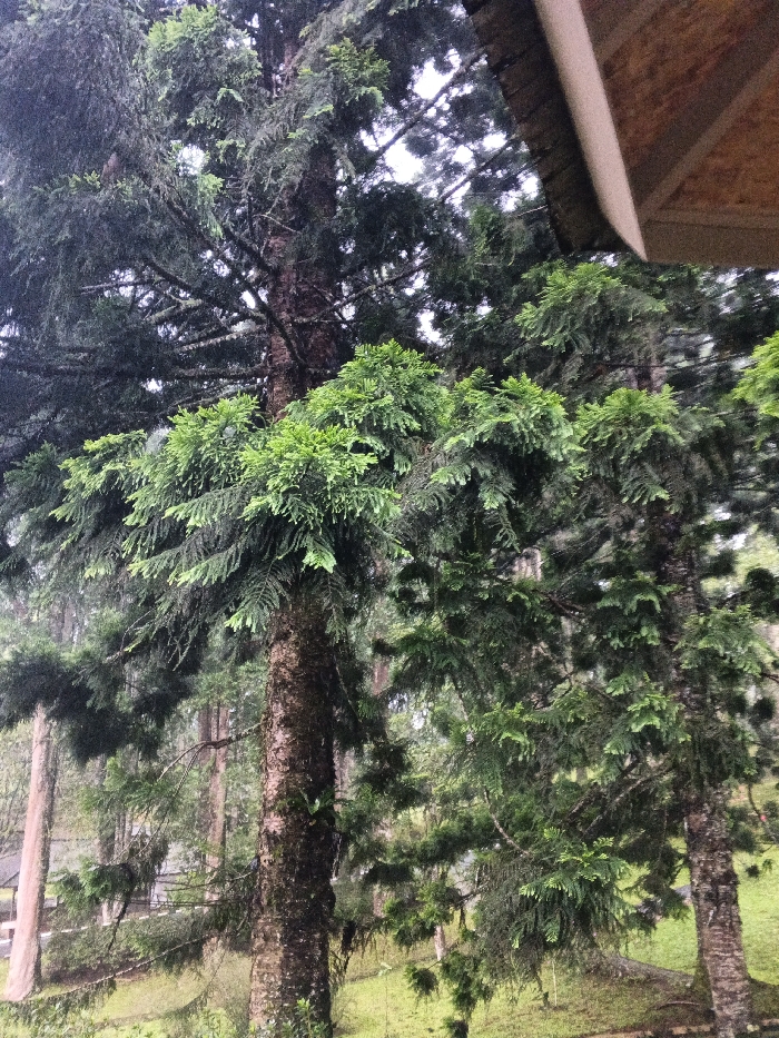 A towering evergreen tree dominates the scene, its dark, textured bark contrasting with vibrant green foliage. Additional trees flank the central figure, adding depth to a slightly overgrown landscape. A portion of a building’s roof peeks into the frame from the upper right corner, suggesting a structure nestled amongst the greenery. The atmosphere evokes a sense of tranquility and natural beauty.