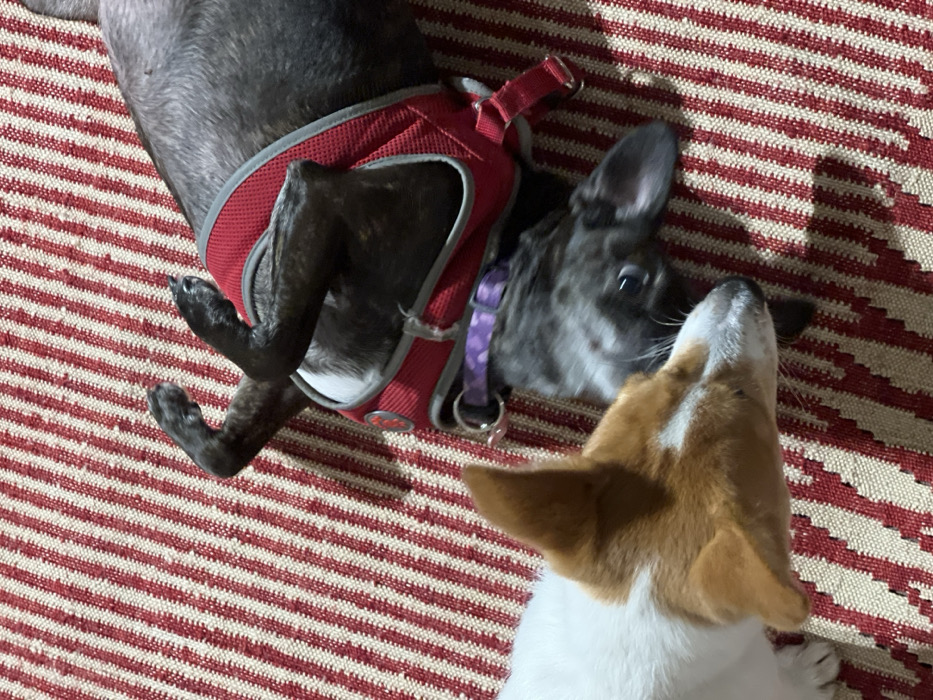 - "Two dogs are lying on a red and cream striped rug" by FM-Uyq9d2, licensed under CC BY 4.0