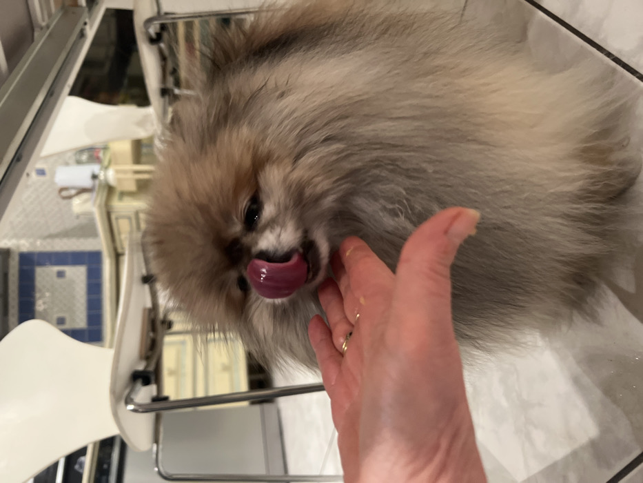 A small, fluffy, light brown Pomeranian dog with a pink tongue sticking out licks a hand