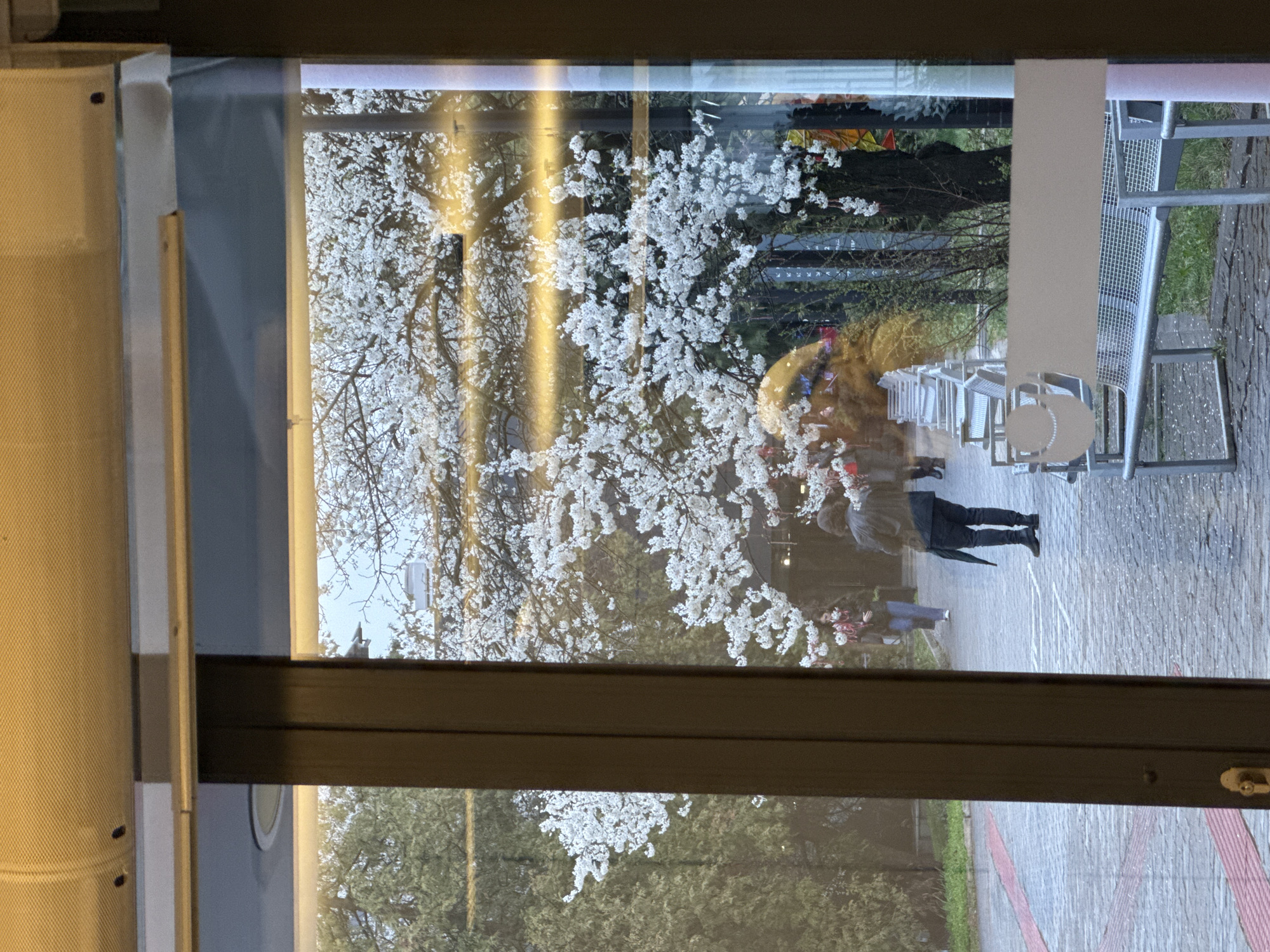 The image presents an outdoor scene viewed through a glass panel, likely a door or large window, from an interior vantage point in Sofia, Bulgaria. The upper portion of the frame shows a beige perforated roller blind and a dark brown door frame. Reflections on the glass include a circular ceiling light at the top-center and an irregular, warm yellow-orange light source in the mid-right. A keyhole with a key is visible at the bottom of the left door frame. A horizontal white sticker with a stylized, crescent-shaped logo is affixed to the lower right glass panel. The outdoor environment depicts a paved pathway constructed from grey cobblestones, featuring reddish-pink linear markings. The path is flanked on the left by a green lawn and trees with dense green foliage. Dominating the mid-ground are several large trees adorned with abundant white blossoms, indicative of spring. In the distance, beyond the trees, blurry architectural structures are visible against an overcast sky. Along the right side of the paved path, multiple light grey metal benches with perforated mesh seats and backs are arranged, facing the pathway. Several individuals are present on the pathway. In the mid-ground on the right, a person with dark hair, wearing a dark jacket and dark trousers, walks away from the viewer, holding a closed dark umbrella in their right hand, pointed downwards. Further along the path, to the left, another person with dark hair, dressed in a dark jacket and lighter-colored trousers, walks toward the left, carrying a bouquet or arrangement of red and pink items. Additional blurry figures are discernible in the background, some also appearing to carry similar red or pink items, suggesting a collective event or celebration. The overall scene suggests an academic or public setting during a spring celebration, commonly associated with university campuses or cultural institutions in Sofia.