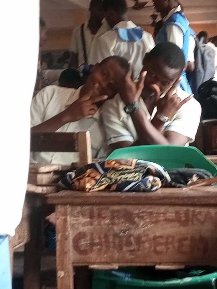 The image depicts an indoor scene, likely a classroom in Obosi, Nigeria, populated primarily by young individuals. In the foreground, two male individuals, appearing to be students, are seated or leaning at a wooden desk. Both wear light-colored, short-sleeved shirts. The male on the left, partially obscured, is making a two-fingered "V" gesture with his right hand near his face. The male on the right, wearing a dark wristwatch on his left wrist, is making a "rock on" hand gesture with both hands near his face. On the weathered wooden desk in the foreground, a folded piece of patterned fabric, featuring dark blue, gold, and white colors, rests next to a green plastic object, possibly a tray. Faint, reddish-brown text is visible on the desk's front, including "CHIJINDERE" and another partially visible word, "UKA." In the blurred background, several other students in similar uniforms, some with blue accents, are visible, either standing or seated. Partial views of ceiling fans are discernible overhead.